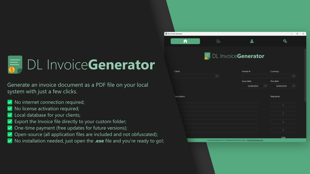 Home: The main window where you select the client, add all necessary information and generate the invoice file;